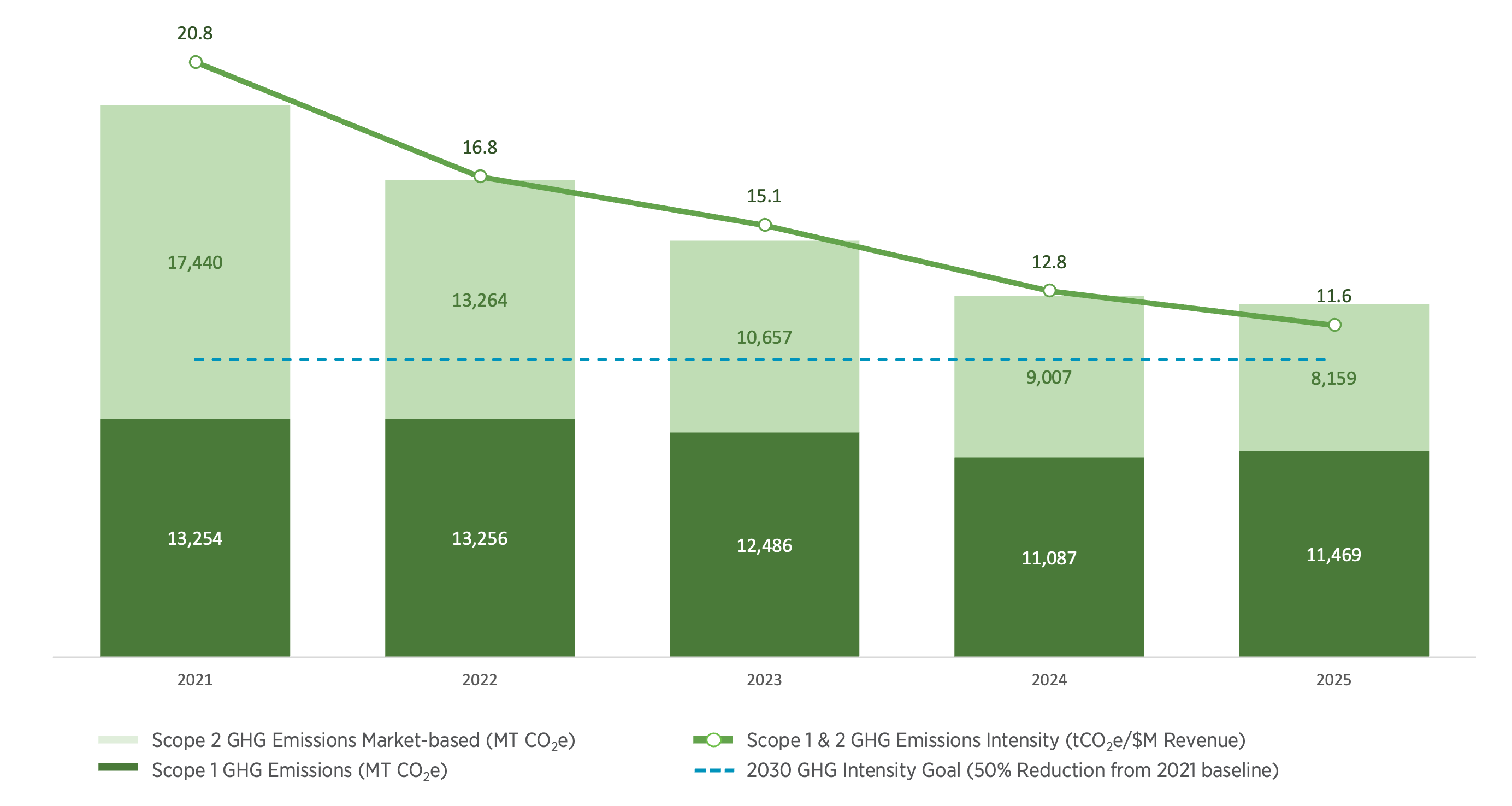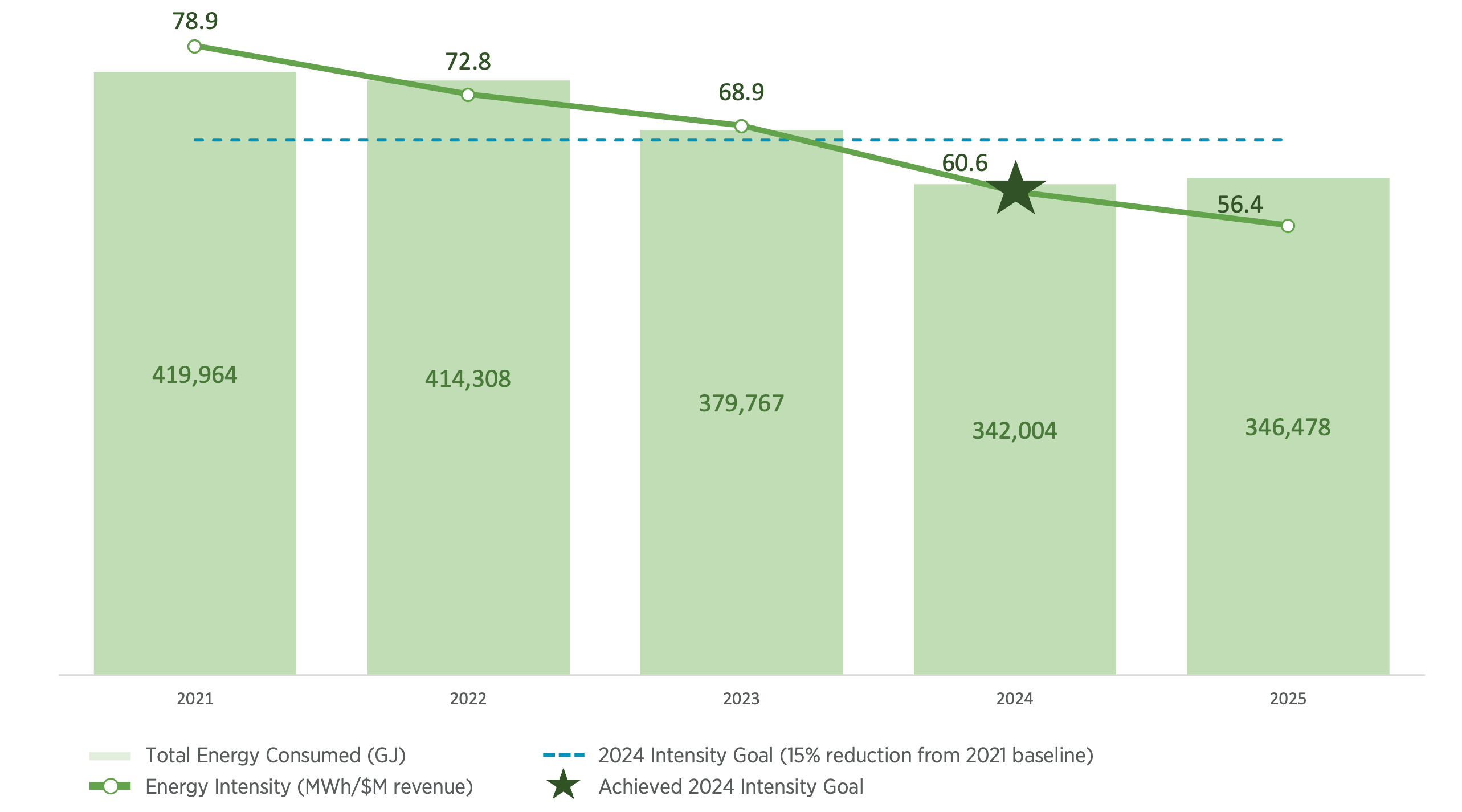 In 2024, we achieved our goal of a 15% reduction in energy intensity (normalized against revenue). We continue to make progress towards our goal of a 50% reduction in greenhouse gas (GHG) intensity (normalized against revenue) by 2030, compared to our 2021 baseline. In 2025, we reduced our energy intensity by 28.1% since 2021, and reduced our GHG intensity by 44.3% since 2021, demonstrating continuous progress.