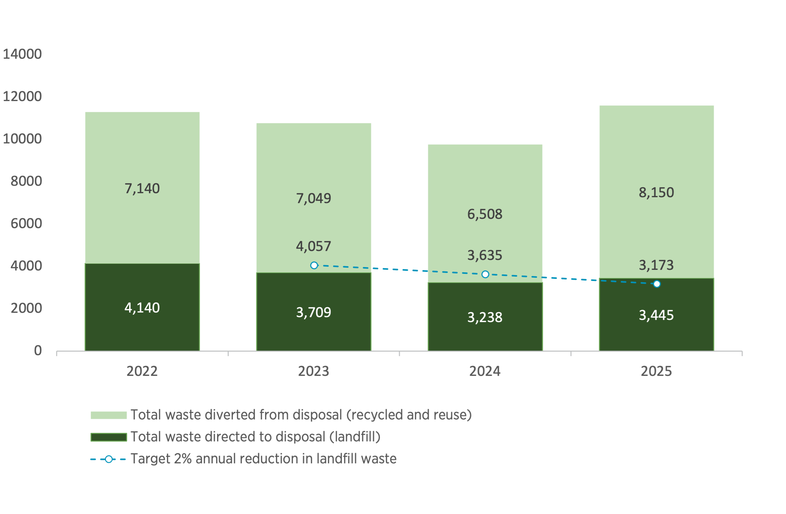 In 2025, our waste to landfill increased 6.4% compared to last year, driven by growth in our operations. The percentage of waste that we were able to recycle increased from 65.6% in 2024 to 69.6% in 2025. We continue to look for additional opportunities to reduce our waste and promote recycling efforts and encourage associates across our organization to share their ideas and suggestions to reduce or divert waste at their facilities, through our WAVES Social Impact Fund Program.